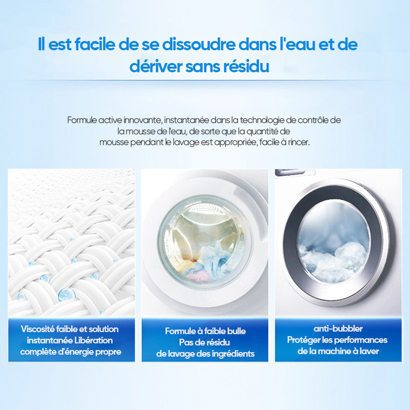 - Formule active innovante - Technologie de contrôle unique de la mousse à eau instantanée, de sorte que la quantité de mousse pendant le lavage est appropriée, facile à rincer. Faible viscosité instantanée Release complète d'énergie propre, formule à faible bulle sans résidus d'ingrédient de lavage, anti-bulle pour protéger les performances de la machine à laver.