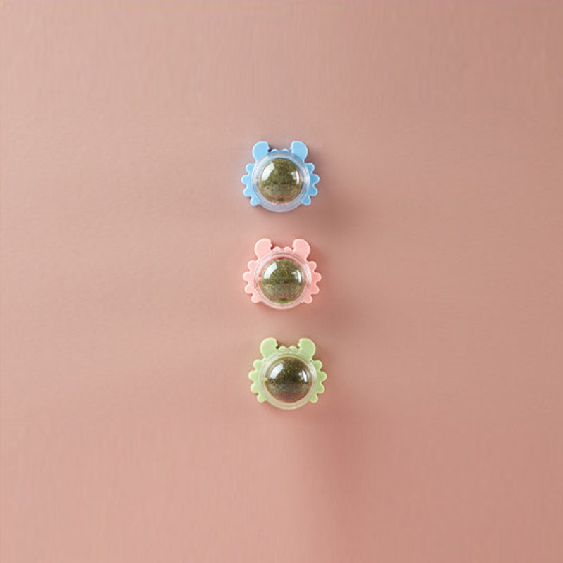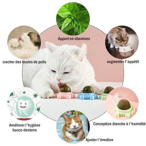 😻 Collant et rotatif : Cette boule d'herbe à chat a un autocollant épais au bas, qui peut être fermement attaché à n'importe quel endroit, comme les murs, les pieds de chaise, les sols, etc., pour éviter toute perte. Il est rotatif pour que votre chat puisse jouer avec, s'amuser et rester en bonne santé.