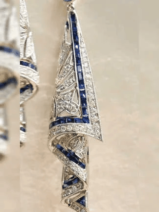 Des boucles d'oreilles au design unique pendent comme de magnifiques écharpes de soie, étincelantes de saphirs et de gravures détaillées.