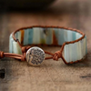 Ce magnifique bracelet enveloppant est soigneusement fait à la main avec des pierres naturelles semi-précieuses d'Amazonite et du cuir véritable. La longueur est d'environ 16,5 cm et elle est ajustable à votre poignet grâce aux 2 fermetures. Le charme représente l'Arbre de Vie symbolisant la sagesse, la force et la protection. Deux options de cuir au choix : brun beige ou marron foncé.