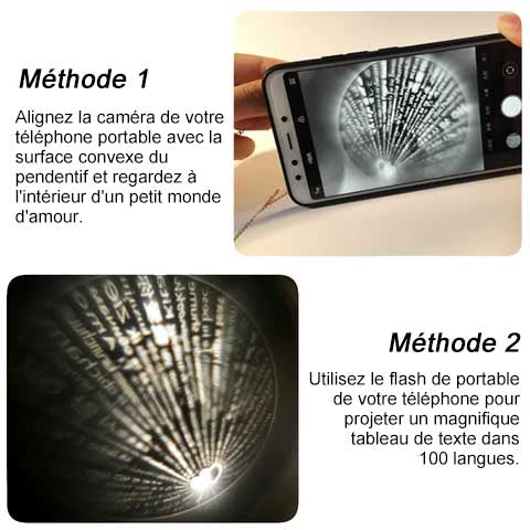 - Le centre du collier Love Projection est en fait une lentille. Regardez profondément dans l'objectif et découvrez un secret incroyable: des mots et des phrases d'amour de 100 langues différentes sont écrits dans ce petit monde magique! Préparez-vous à l'effusion d'amour et de baisers lorsque vous montrez à votre bien-aimé cet incroyable secret caché dans son magnifique collier.