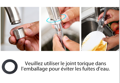 La buse de robinet longue durée convient aux robinets à forte courbure. 3 Mode de pulvérisation : en tirant sur la tête de pulvérisation pour basculer, la position fermée est pour un jet puissant et la position ouverte est pour une pulvérisation d'aérateur douce.