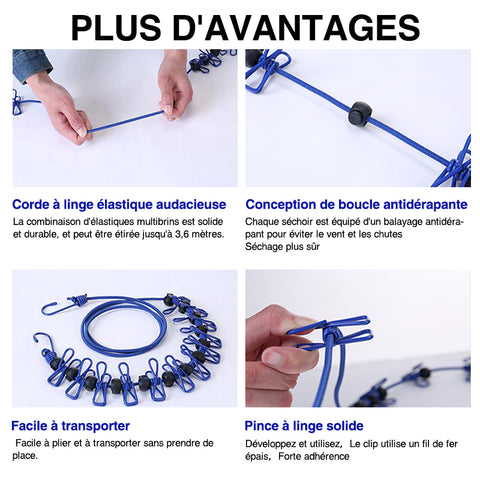 ❤☞ Séchoir de voyage portable à clip multifonctionnel avec crochets en acier des deux côtés, peut être fixé n'importe où: hôtel, salle de bain, buanderie, camping-car, bateau, balcon ou même dans les arbres.